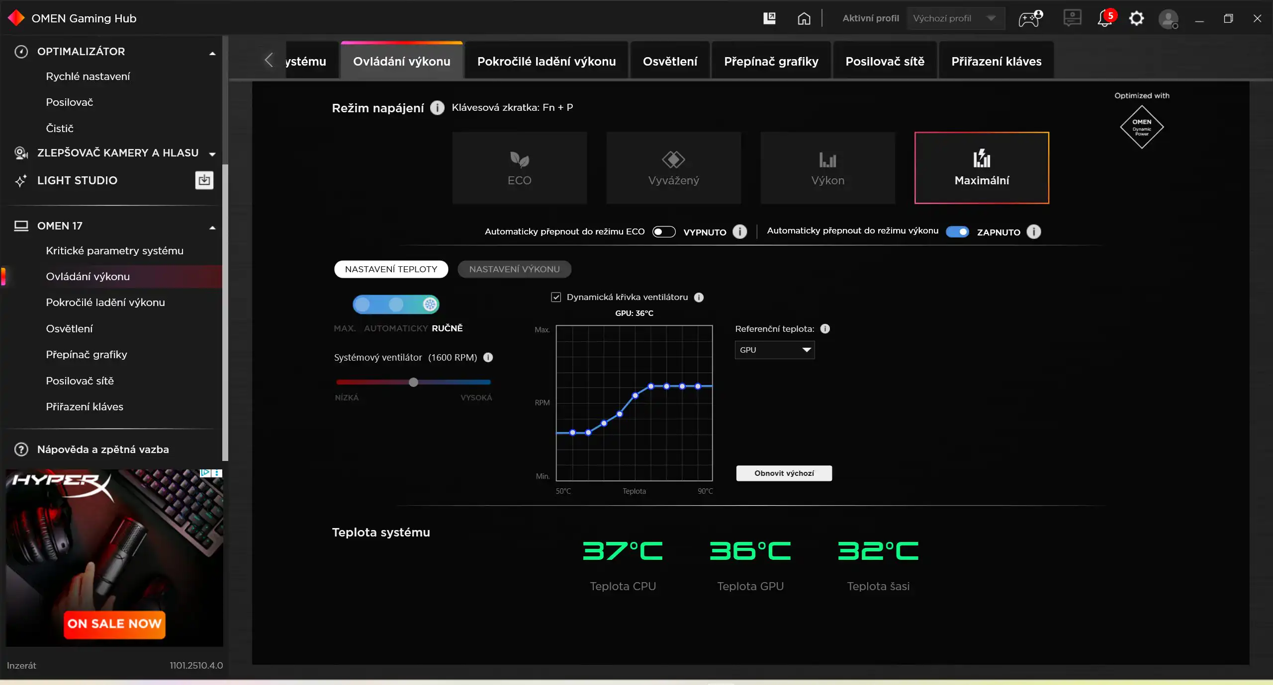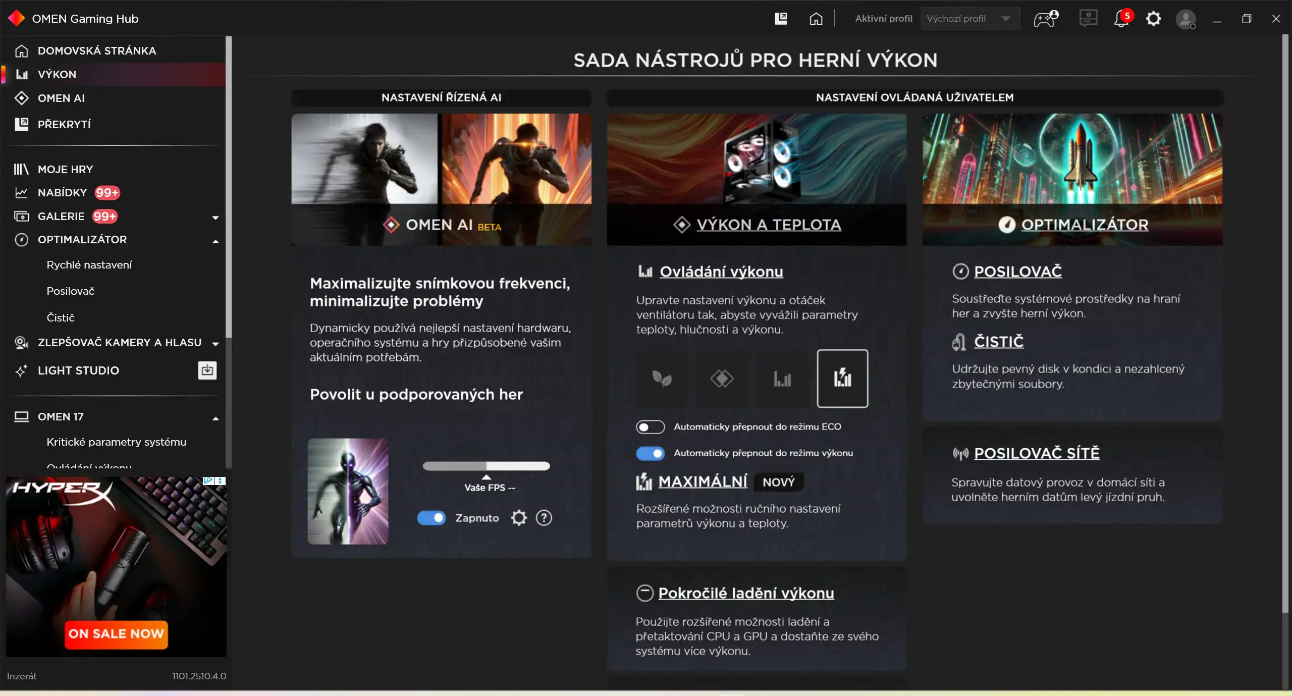 Notebook ponúka predinštalovanú aplikáciu OMEN Gaming Hub, ktorá ponúka množstvo nástrojov na monitoring a zlepšenie výkonu. Pre často sa presúvajúcich používateľov bude najzásadnejšie prepínanie režimov výkonu – ECO, Vyvážený, Výkon a Maximálny.