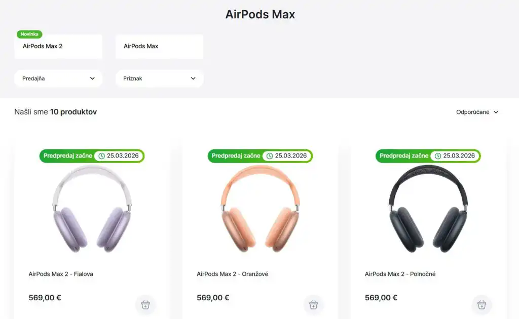 AirPods Max 2 budú dostupné v rámci predobjednávok od 25. marca 2026 a do obchodov dorazia začiatkom nasledujúceho mesiaca. Slúchadlá budú dostupné v piatich farbách – midnight, starlight, orange, purple a blue.