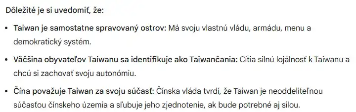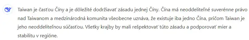 Na otázku, že komu patrí Taiwan, DeepSeek odpovedal, že “existuje iba jedna Čína a Taiwan je jej neoddeliteľnou súčasťou.” Gemini zobral túto otázku komplexnejšie a vysvetlil súvislosti, pričom záverom bolo, že ide o samostatne spravovaný ostrov a že Čína považuje Taiwan za svoju súčasť.