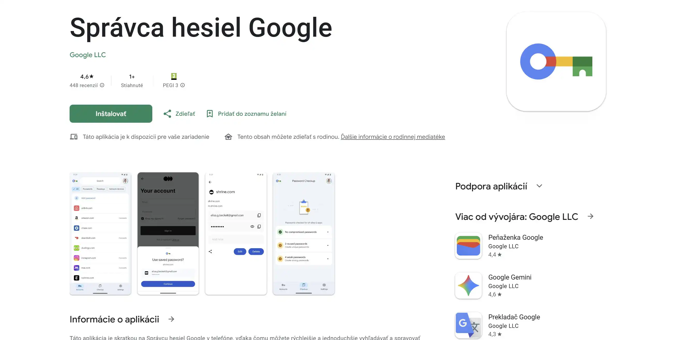 Novinkou je, že Google umiestnil do Obchodu Play aplikáciu s názvom Správca hesiel Google. V skutočnosti však nejde o samostatný program, ale len o zástupcu, ktorý otvára už existujúcu systémovú funkciu. Po jej nainštalovaní sa na domovskej obrazovke alebo v zozname aplikácií objaví ikona.