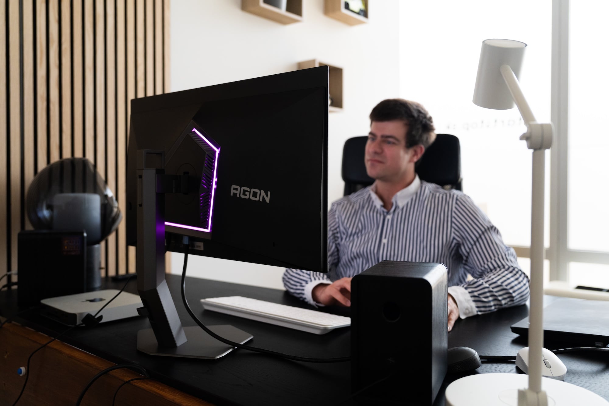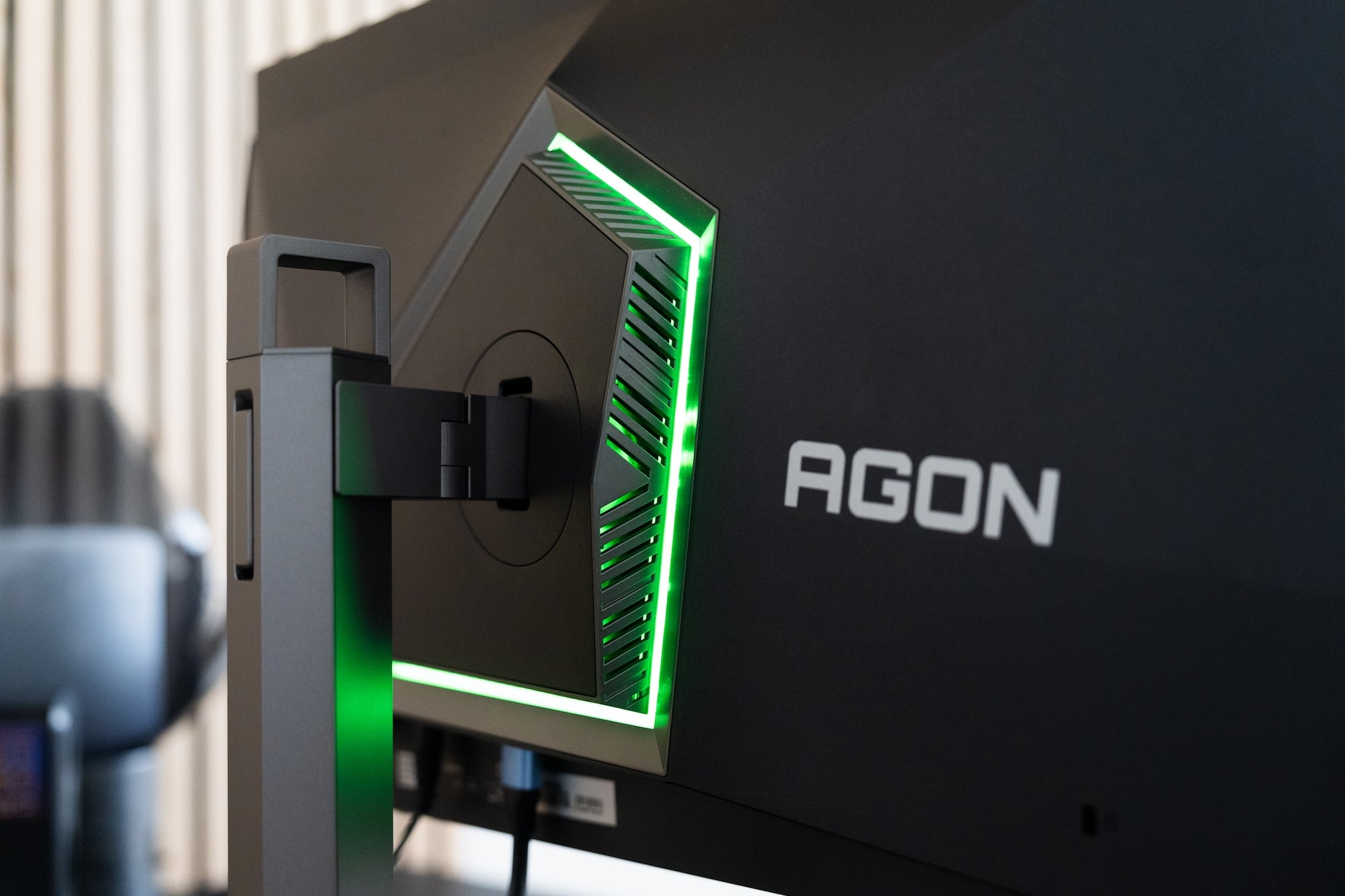 Zaujímavým doplnkom monitora je aj integrovaný LED pás, ktorý môže svietiť statickou farbou zozadu na stenu a spríjemňovať tak prechod medzi jasným obrazom na paneli a tmavou izbou, alebo blikať v rôznych farbách. Na rozdiel napríklad od televízorov Philips Hue však svieti len náhodne a nesynchronizuje sa s obsahom hry. Cez aplikáciu AOC G-Menu sa však dá jeho farba zosúladiť aspoň s podsvietenou klávesnicou alebo myšou od rovnakej značky AGON.