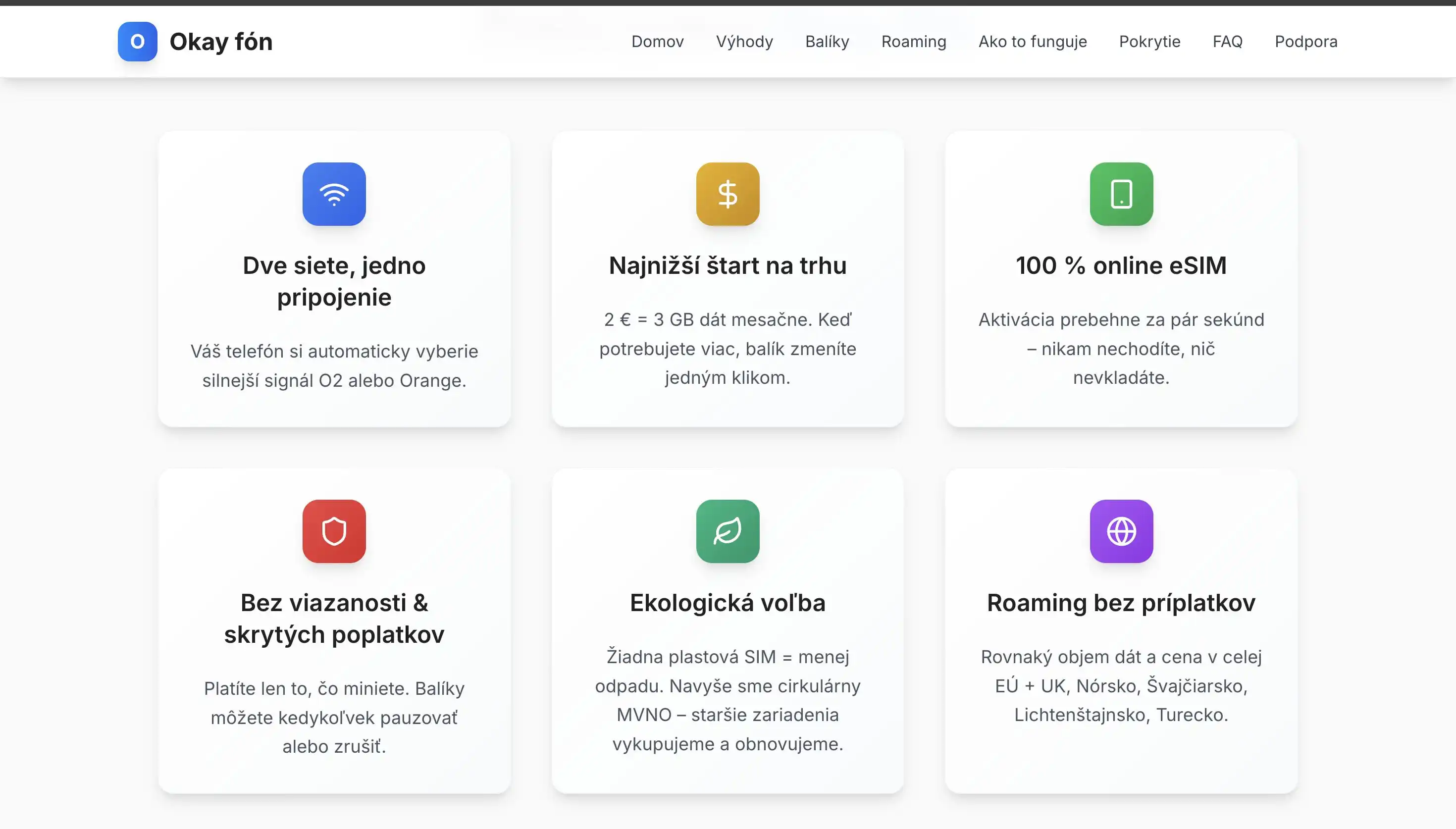 Okay fón je výhradne dátový operátor, ktorý ponúka eSIM bez možnosti telefonovania a SMS. Cieľom bolo osloviť mladších zákazníkov, ktorí komunikujú výlučne cez internet. Operátor využíval siete O2 a Orange, pričom v Orange fungovalo aj 5G pripojenie.
