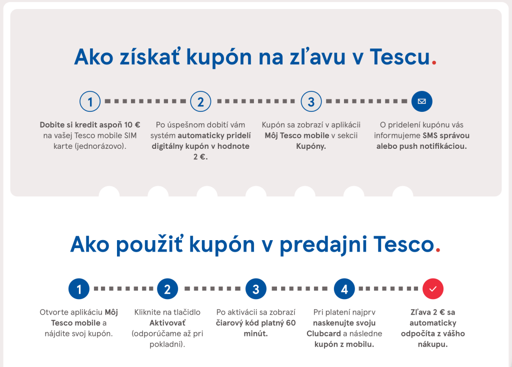 Celý proces získania odmeny prebieha digitálne. Po dobití kreditu sa kupón automaticky zobrazí v aplikácii Môj Tesco Mobile, pričom zákazník dostane aj notifikáciu, že ho môže využiť.