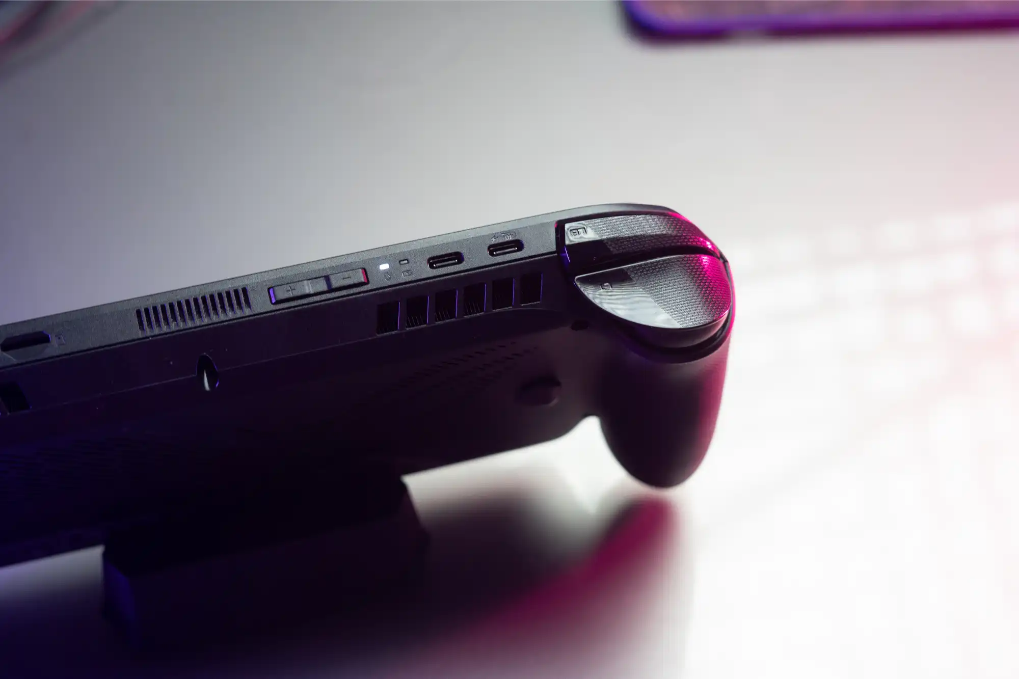Vzhľadom na množstvo vnútorných komponentov a snahu o celkovú tuhosť inžinieri, logicky, zavrhli možnosť odnímateľných rukovätí. V balení nie je ani dokovacia stanica po vzore Switchu. Nie, že by sme cítili potrebu pripájať handheld k televízoru a hrať s ďalším externým ovládačom (hoci USB-C konektor hore naozaj zvládne prenášať aj obraz), no fajn by bola aspoň nejaká kolíska na nabíjanie. Takto treba nabíjací kábel vždy pripájať ručne.