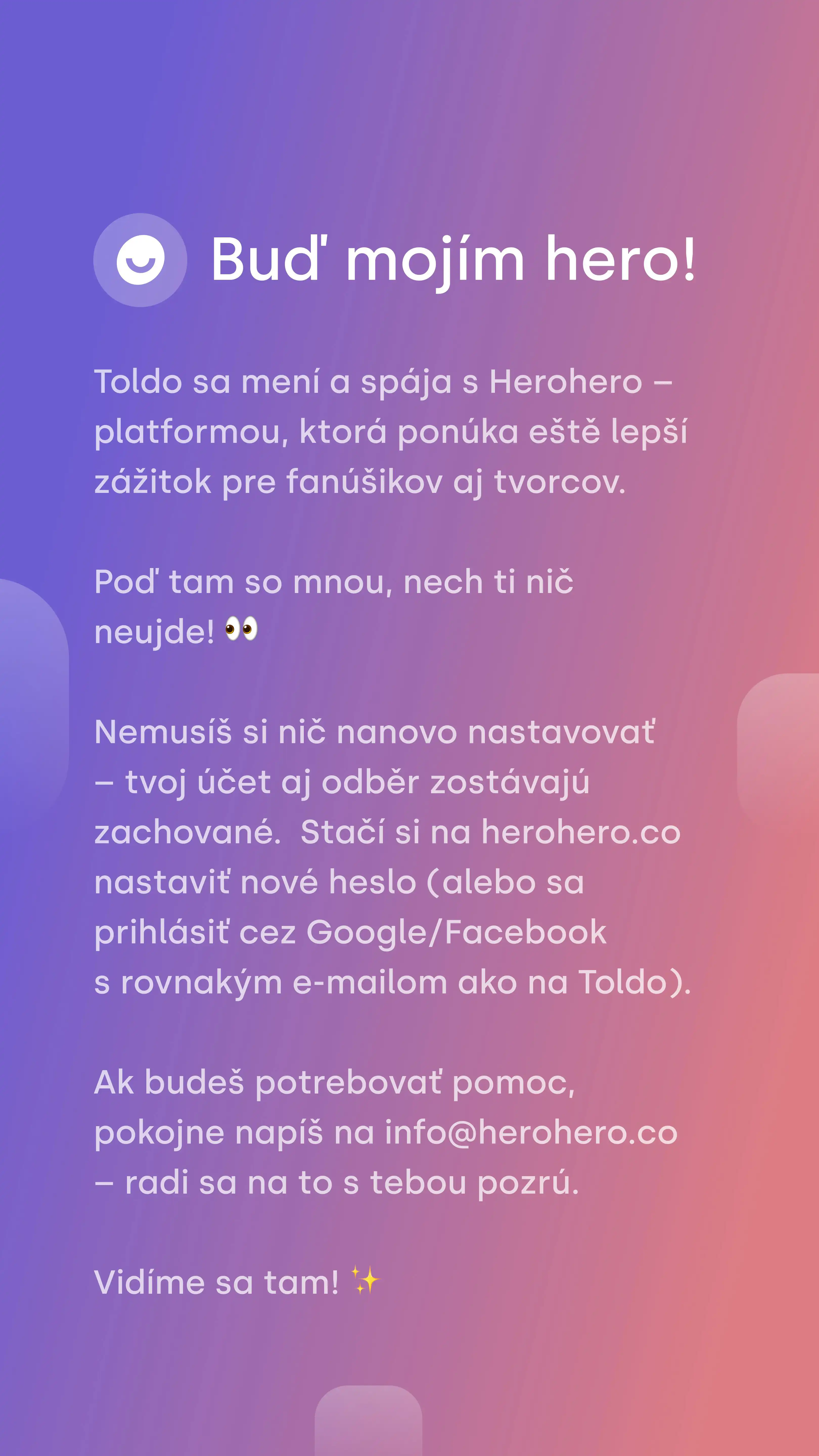 Prechod z Toldo na HeroHero sa snaží byť pre tvorcov aj fanúšikov čo najplynulejš. Používateľské kontá a odbery zostávajú plne zachované. Ako informuje samotná platforma, nie je potrebné nič nanovo nastavovať. Stačí si na stránke herohero.co nastaviť nové heslo, prípadne sa prihlásiť cez Google alebo Facebook s rovnakým e‑mailom, aký používali na Toldo. Pre všetkých, ktorí potrebujú pomoc alebo majú otázky, je pripravená podpora na adrese [email protected].