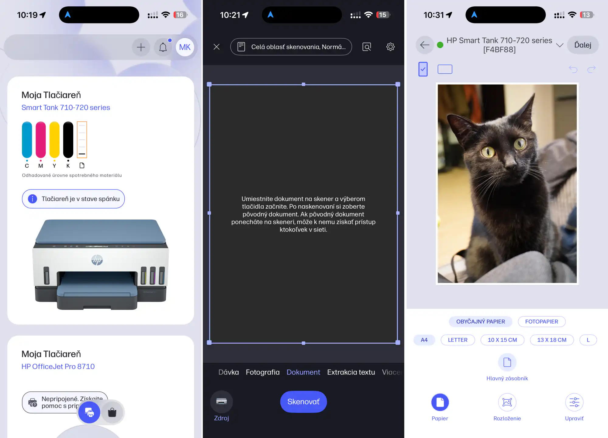 Oveľa lepšie vyzerá párovacia aplikácia, ktorá zobrazuje stav náplní aj zásobníka papiera. Môžete z nej tiež skenovať aj so všetkými funkciami, ktoré by ste očakávali od softvéru na počítači – to znamená vyberať konkrétnu plochu skenu aj rôzne režimy. Dokument sa potom dá vytlačiť, odoslať e-mailom alebo uložiť priamo do mobilu.