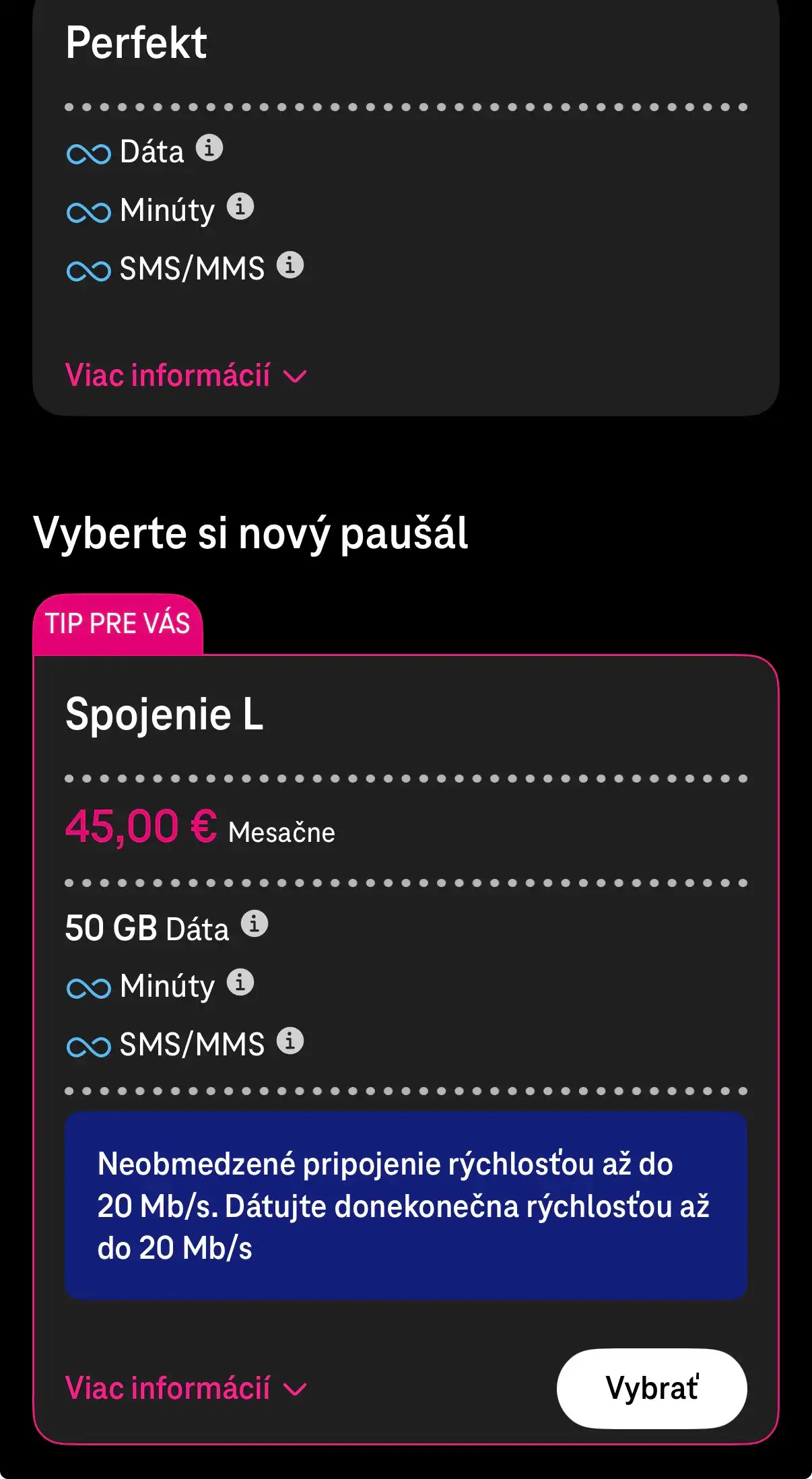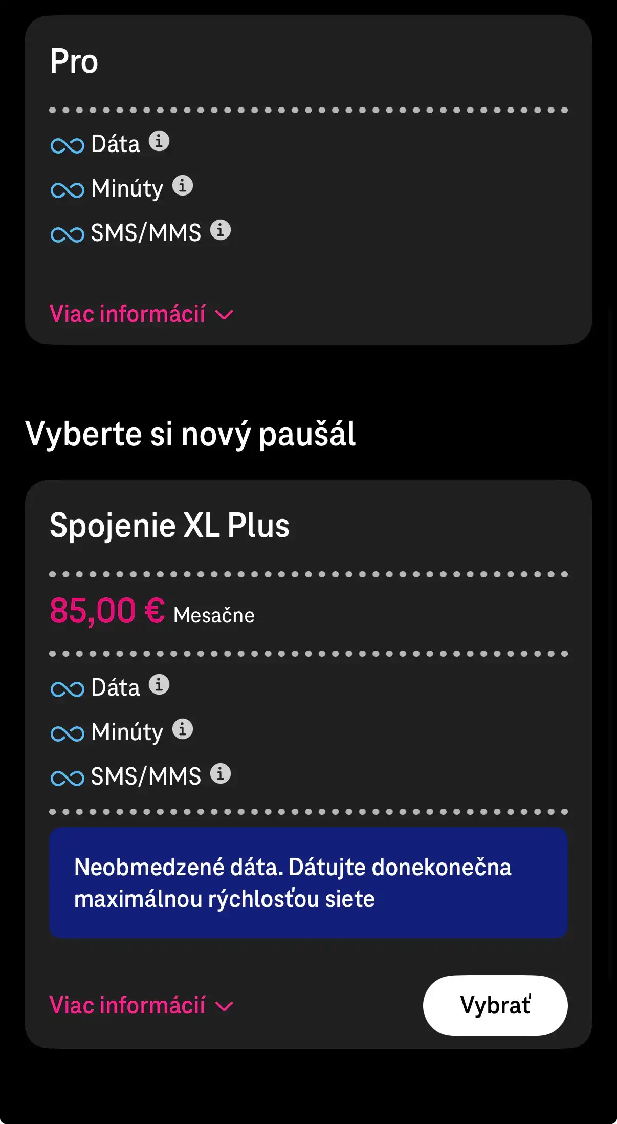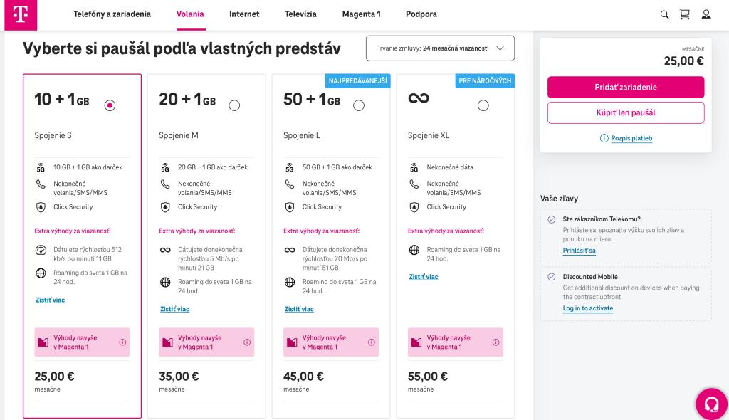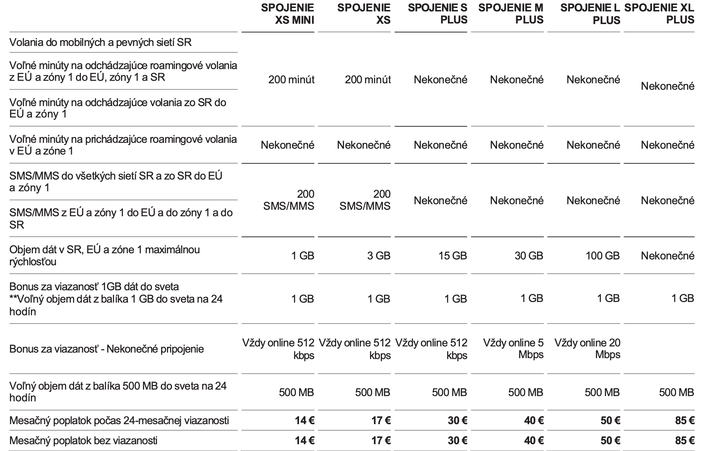 Doplnkové paušály z nižšej cenovej kategórie (napríklad Spojenie XS Mini za 14 eur alebo Spojenie XS za 17 eur) predstavujú skôr základnú vstupnú ponuku operátora. Ich hlavnou výhodou je nízka mesačná cena, ktorá je výrazne nižšia než pri hlavných paušáloch v portfóliu. Z tabuľky vyplýva, že tieto programy ponúkajú približne 200 minút a 200 SMS, menší objem dát (1 až 3 GB) a po jeho vyčerpaní možnosť zostať online cez službu „Vždy online“ so zníženou rýchlosťou približne 512 kb/s.