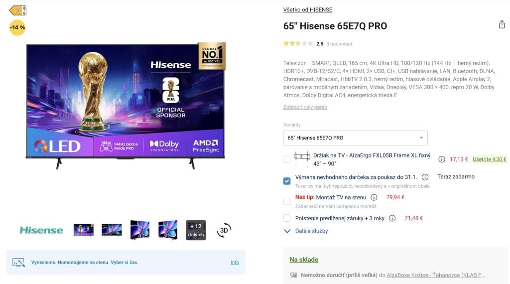 3) Hisense 65″ PRO + stojan na TV v zľave takmer 100 €