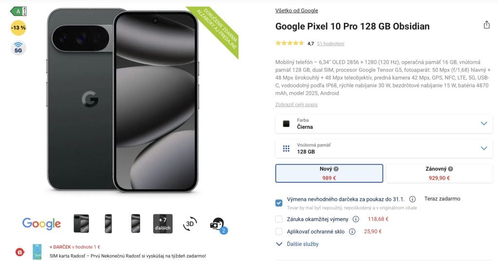 1) Google Pixel 10 Pro (128 GB) len za 989 €