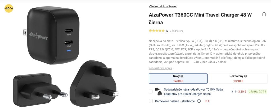 4) AlzaPower cestovná nabíjačka s redukciou v zľave 40%