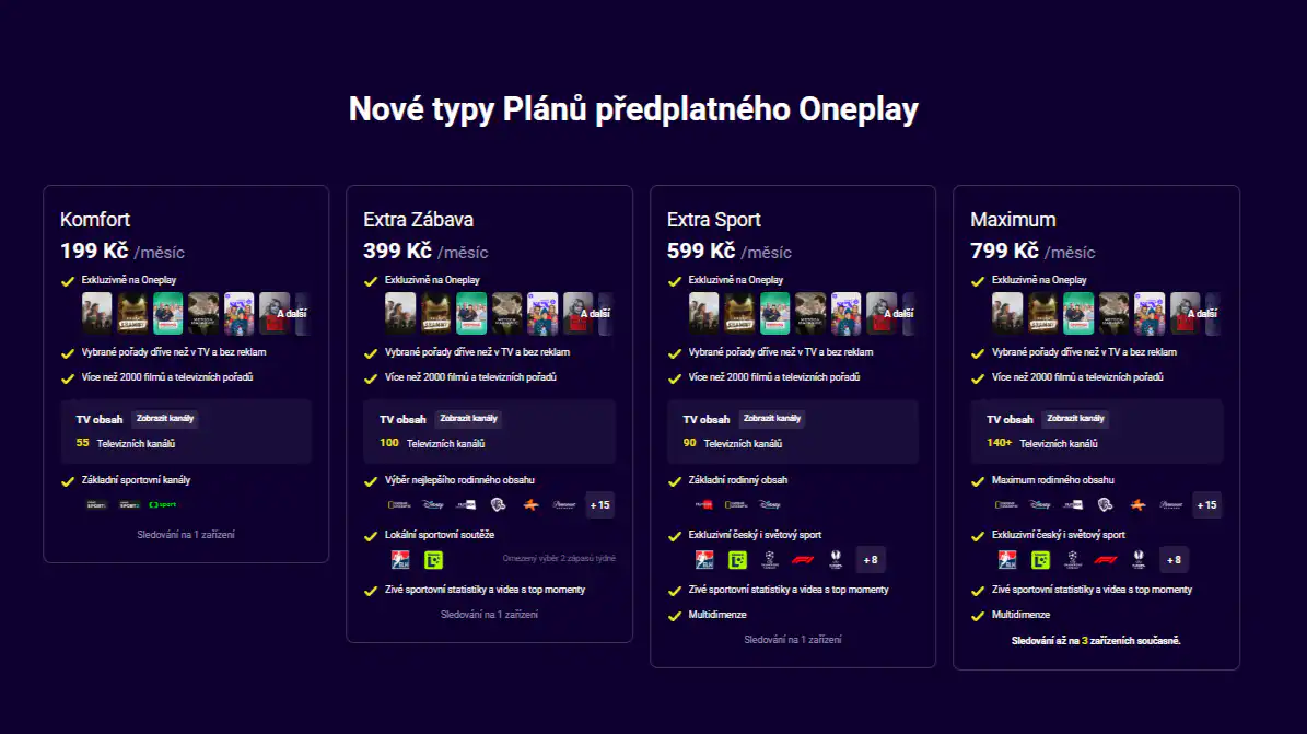 Oneplay ponúkne celkom štyri rôzne možnosti predplatného – Komfort (približne 7,99 eur mesačne), Extra zábava (približne 16 eur mesačne), Extra šport (približne 24 eur mesačne) a Maximum (približne 32 eur mesačne).