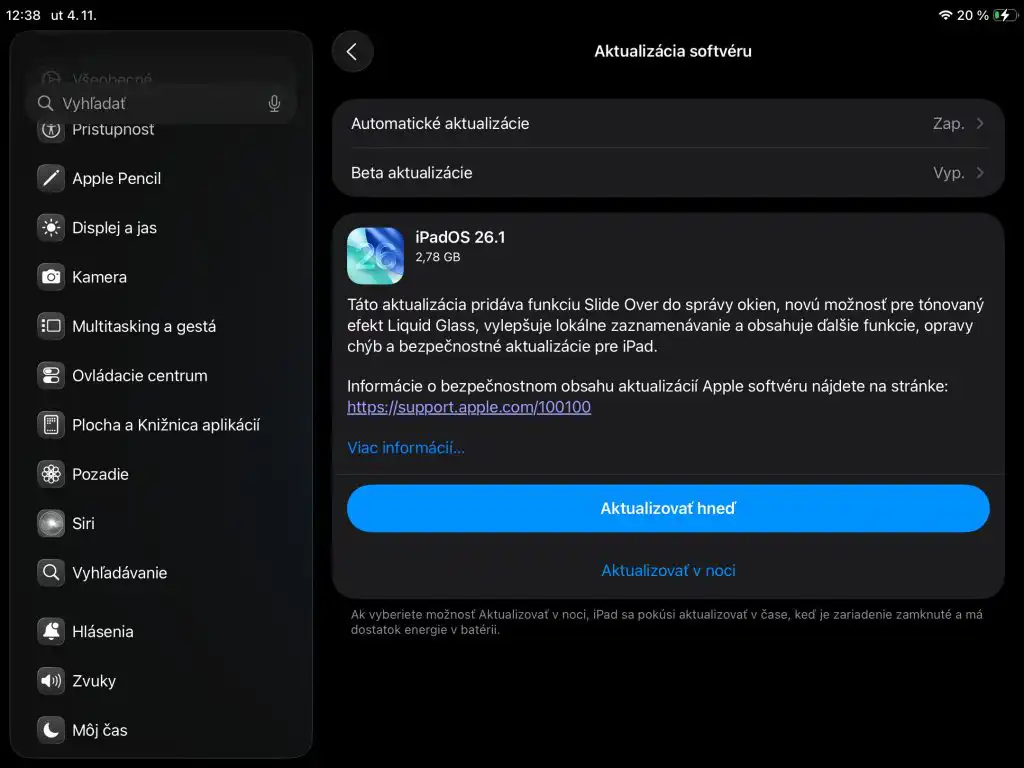 Spoločnosť Apple oficiálne vydala aktualizáciu iOS 26.1, ktorá predstavuje prvú dôležitú čiastkovú aktualizáciu pre operačný systém iOS 26. Táto verzia prináša viaceré vylepšenia zamerané na vizuálny zážitok, interakciu s aplikáciami, umelú inteligenciu a štandardy digitálnej bezpečnosti. Aktualizácia je dostupná pre modely iPhone 11 a novšie, vrátane druhej generácie iPhone SE a to aj na Slovensku.