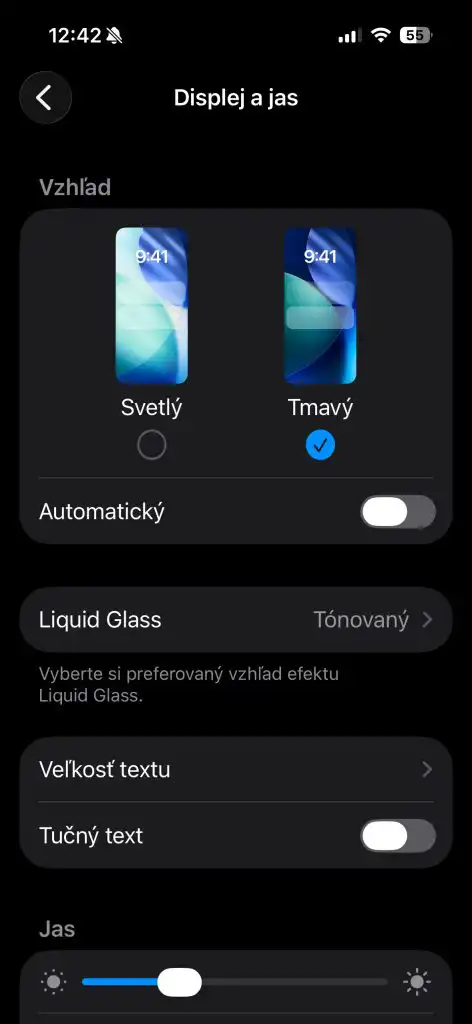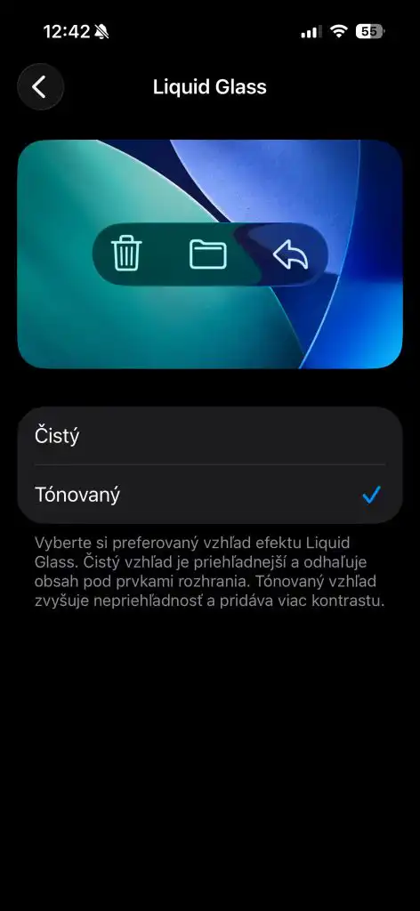 Najvýraznejšou novinkou je rozšírenie nastavenia „Liquid Glass“, ktoré umožňuje používateľom zvýšiť nepriehľadnosť tohto materiálu. Nová voľba dovoľuje prepínať medzi predvoleným čírym vzhľadom a novým „tónovaným“ (tzv. tinted) variantom, ktorý zvyšuje kontrast v aplikáciách a notifikáciách na uzamknutej obrazovke.