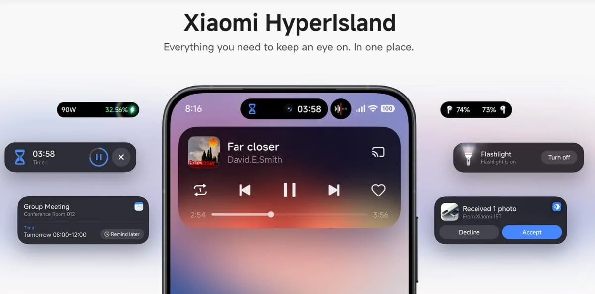 HyperOS tiež kopíruje iOS a v ostrovčeku okolo predného foťáku dokáže zobrazovať niektoré informácie zo systémových aplikácií – napríklad zostávajúci čas v časovači, rýchlosť nabíjania či náhľad na aktuálne prehrávanú hudbu či podcast. Keďže po dotyku prsta sa do týchto aplikácií dostanete oveľa rýchlejšie, inšpiráciu konkurenciou preto skôr chválim.